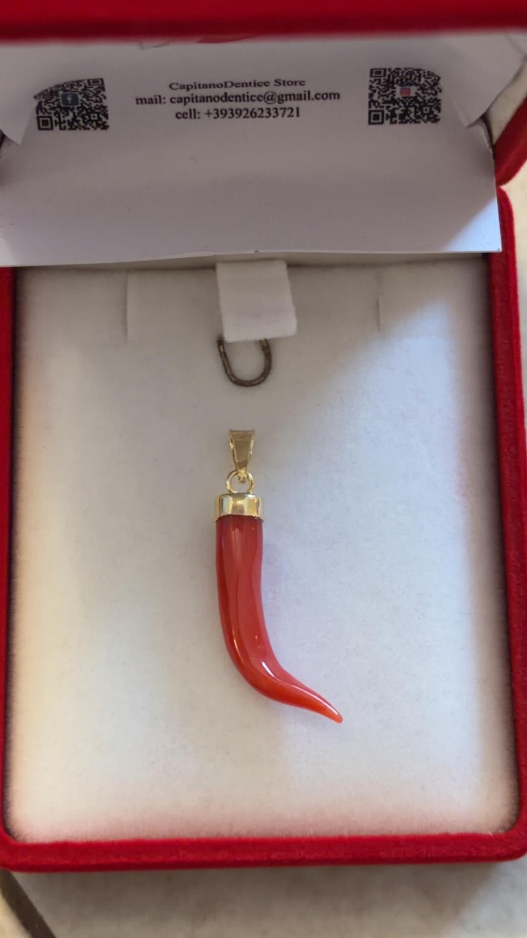 "Lasciati incantare dalla bellezza e dal significato profondo di questa esclusiva collana con ciondolo a forma di corno, realizzato con autentico corallo rosso del Mediterraneo. Simbolo di antica tradizione italiana, il "cornetto" è un potente portafortuna, un talismano di protezione contro il malocchio e un amuleto di forza e prosperità.
